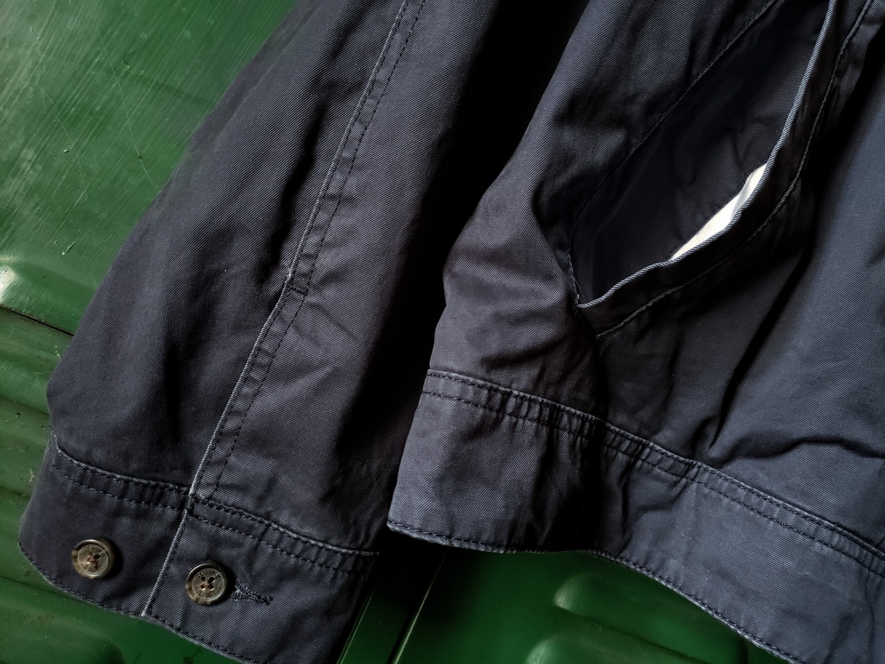 チノパンのようにしっかりとして丈夫そうな生地です。コットンツイルのような艶っとした手触りで、なめらかさと少し光沢感もあります。