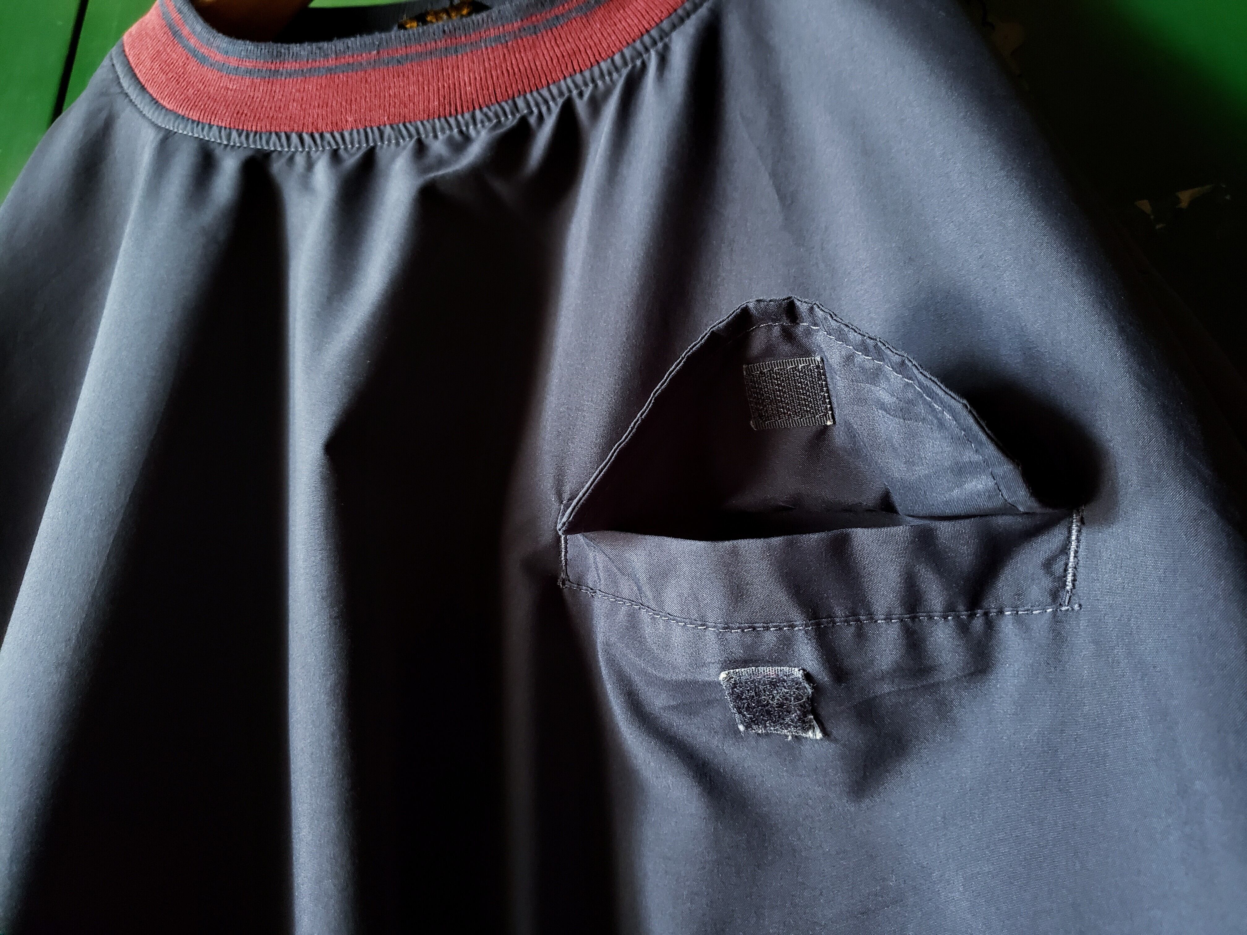 色はマッドな濃紺ボディーにエンジのリブがきいてます。光のあたり加減で光沢感の陰影が特徴的です。