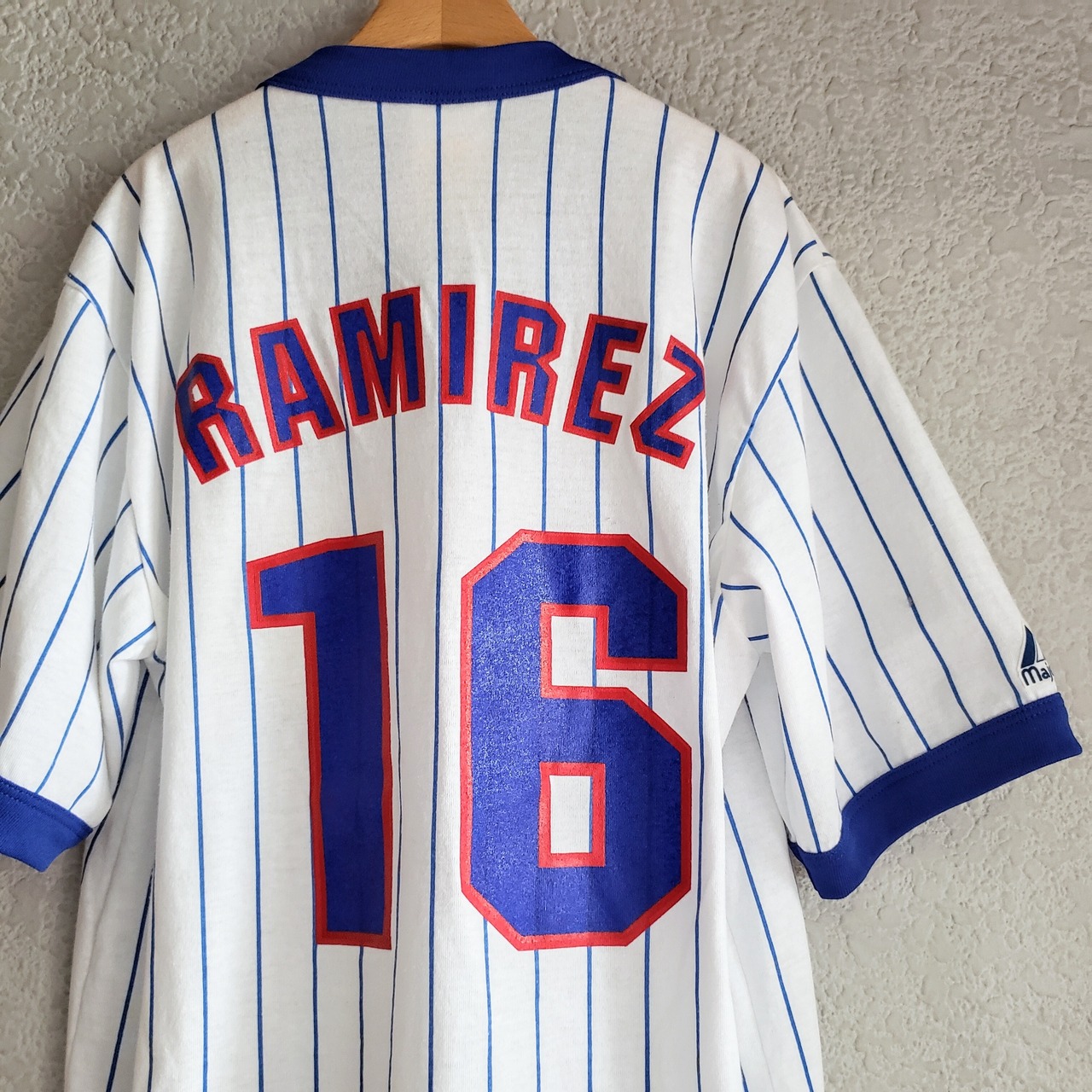 白地にカブスカラー青のストライプ。