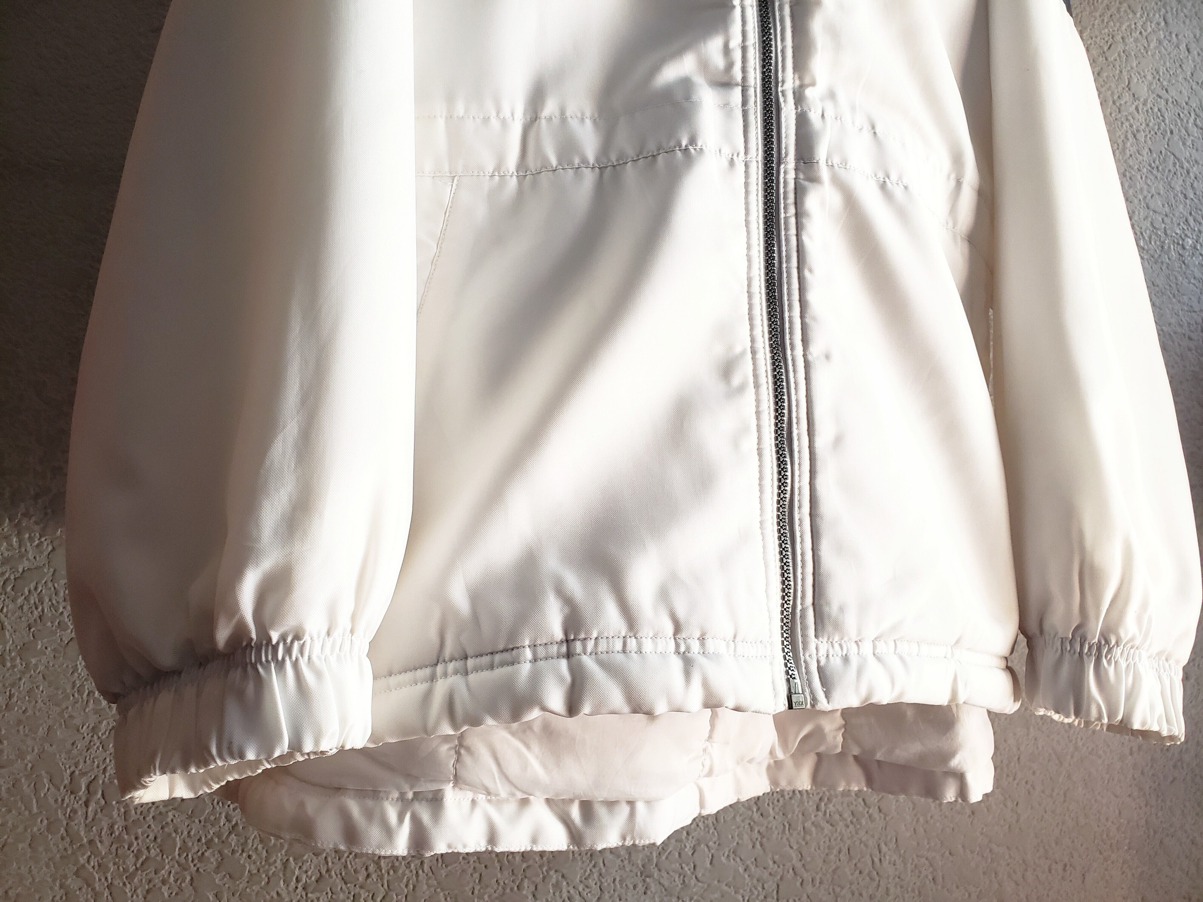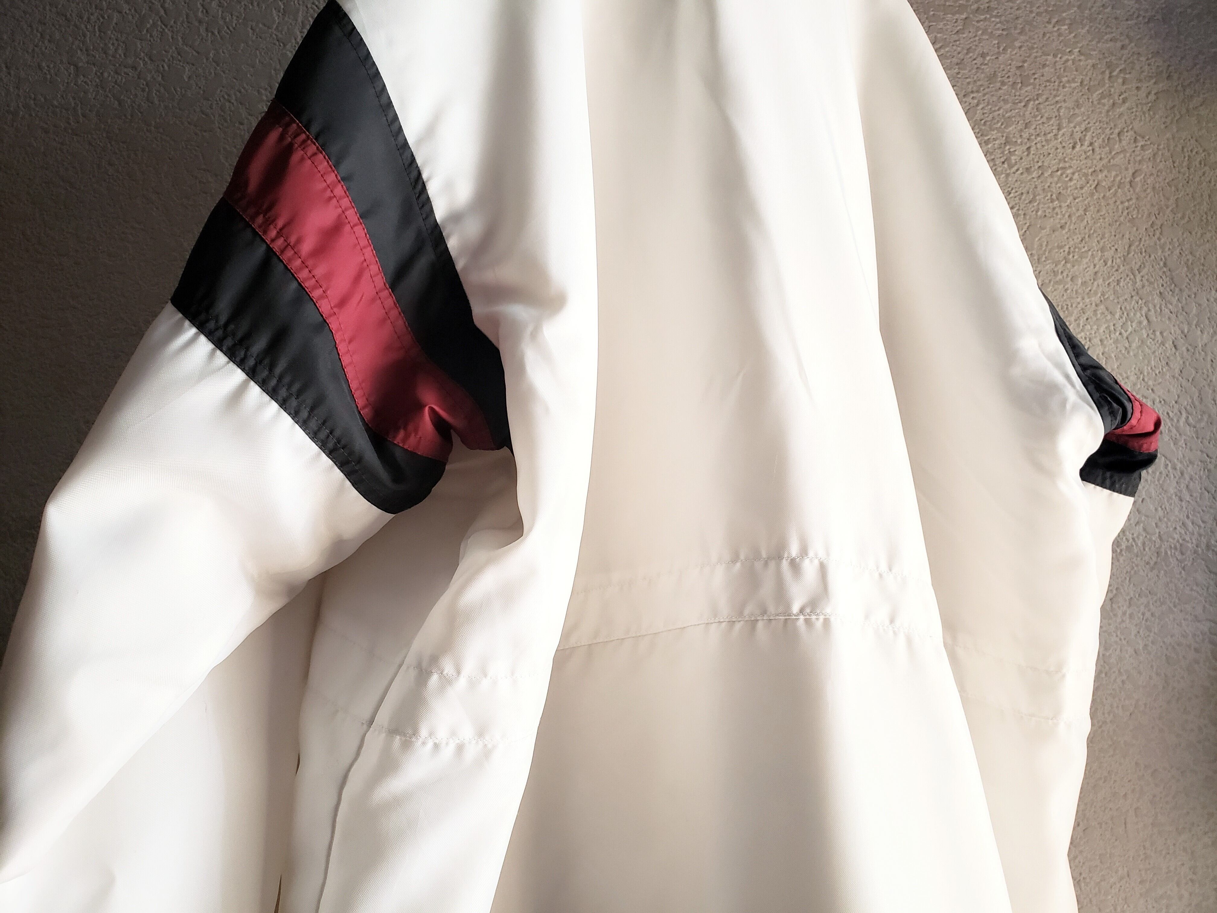 白い部分はしっかりとしたポリエステル生地で、腕の紺とエンジ色はナイロンになります。