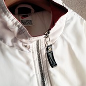 ライナーのタグ近くにボールペンの線のような汚れと少しステッチ抜け、左腕の紺とエンジ色の部分に小さな傷があります。