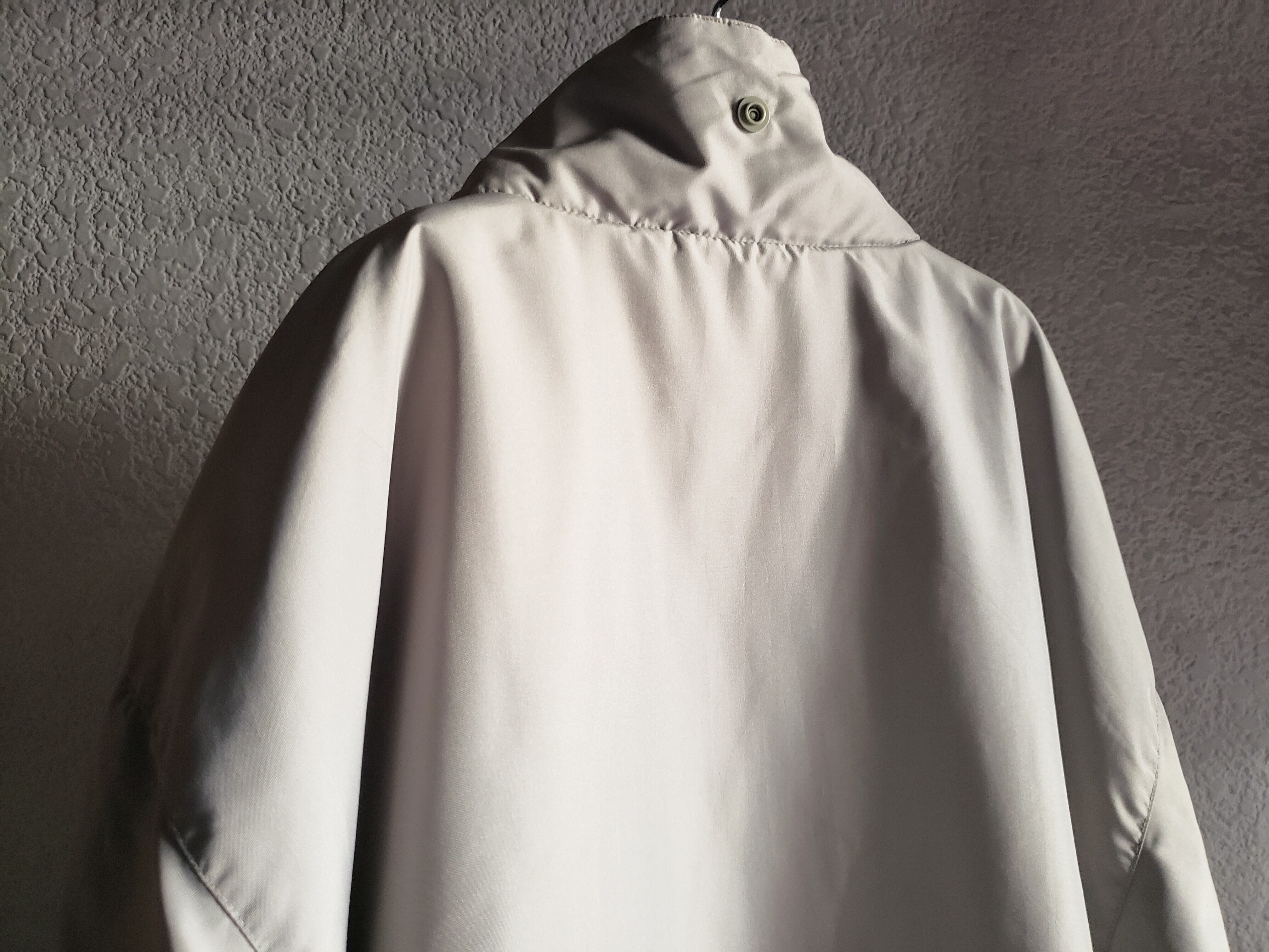襟にスナップボタンが付いてますがフードはありません。