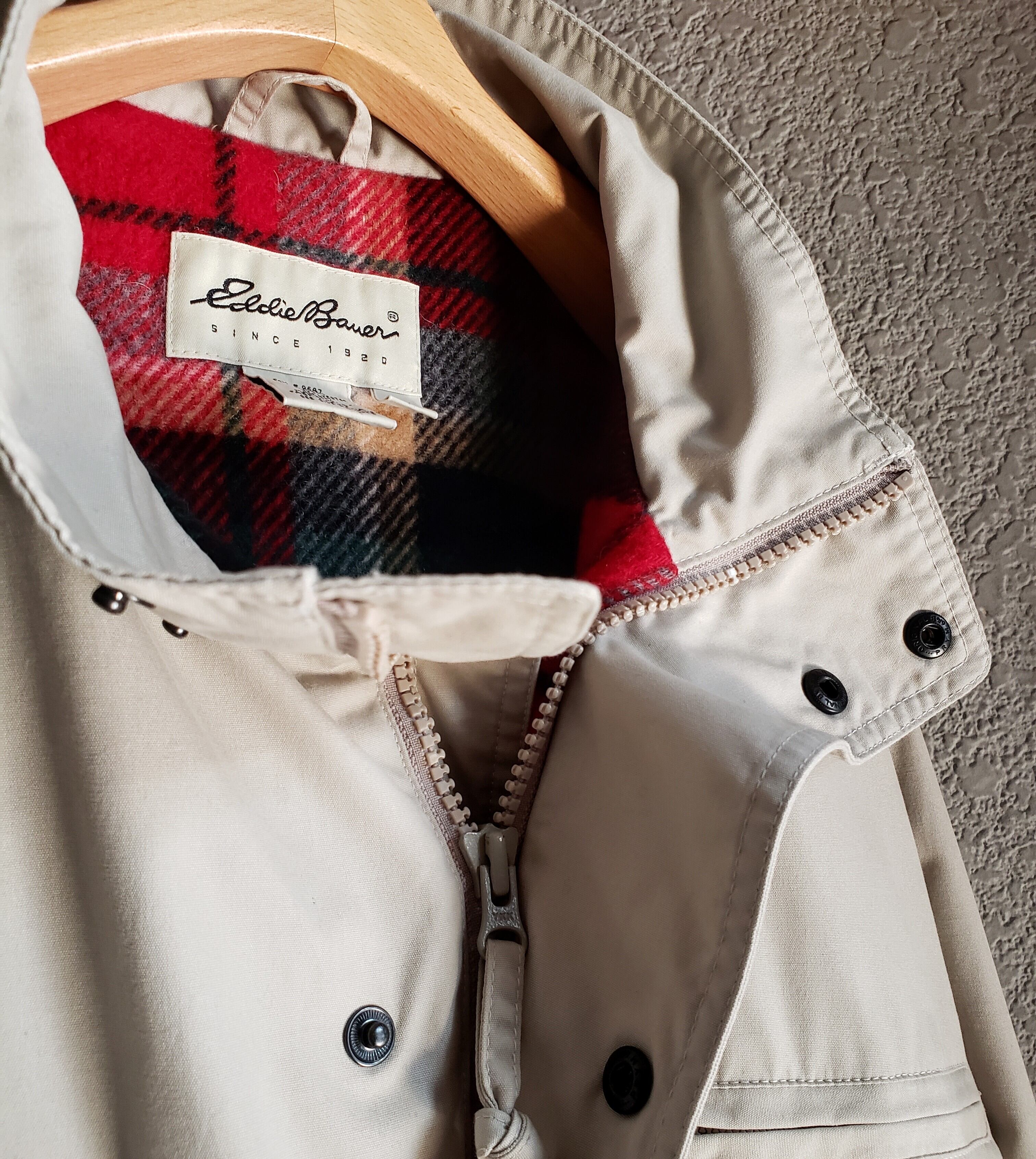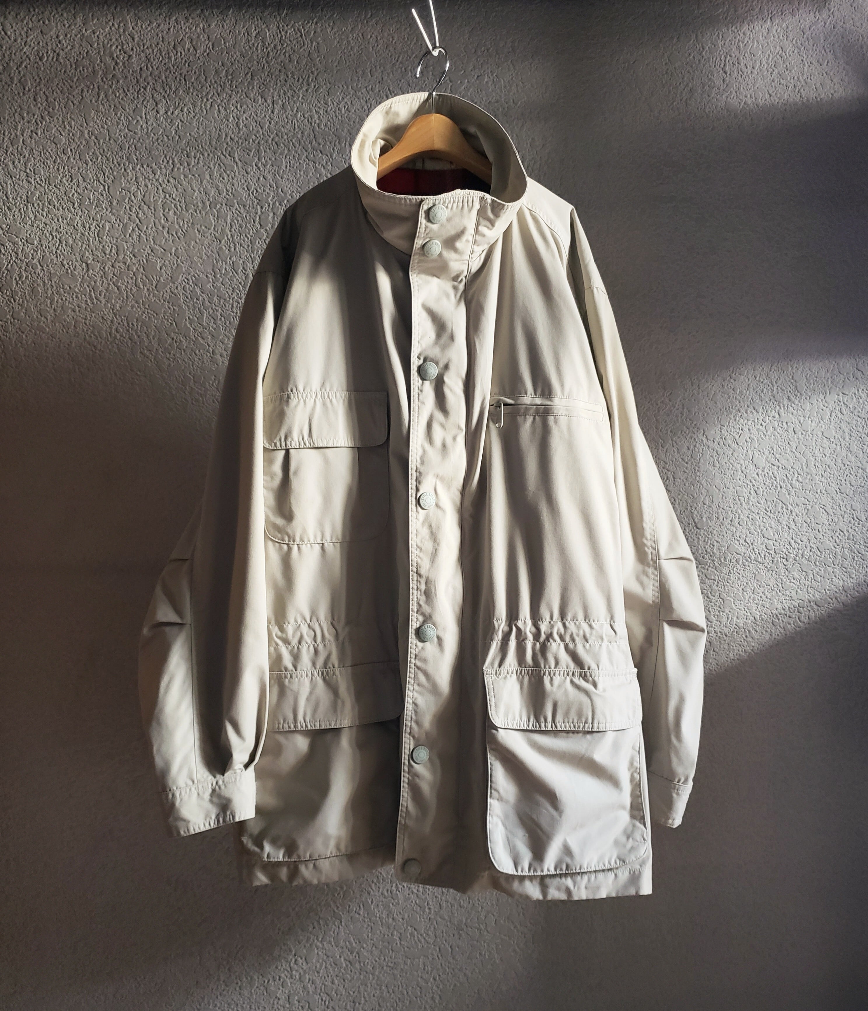アイボリー色のシェルに、赤いチェックのライナー。